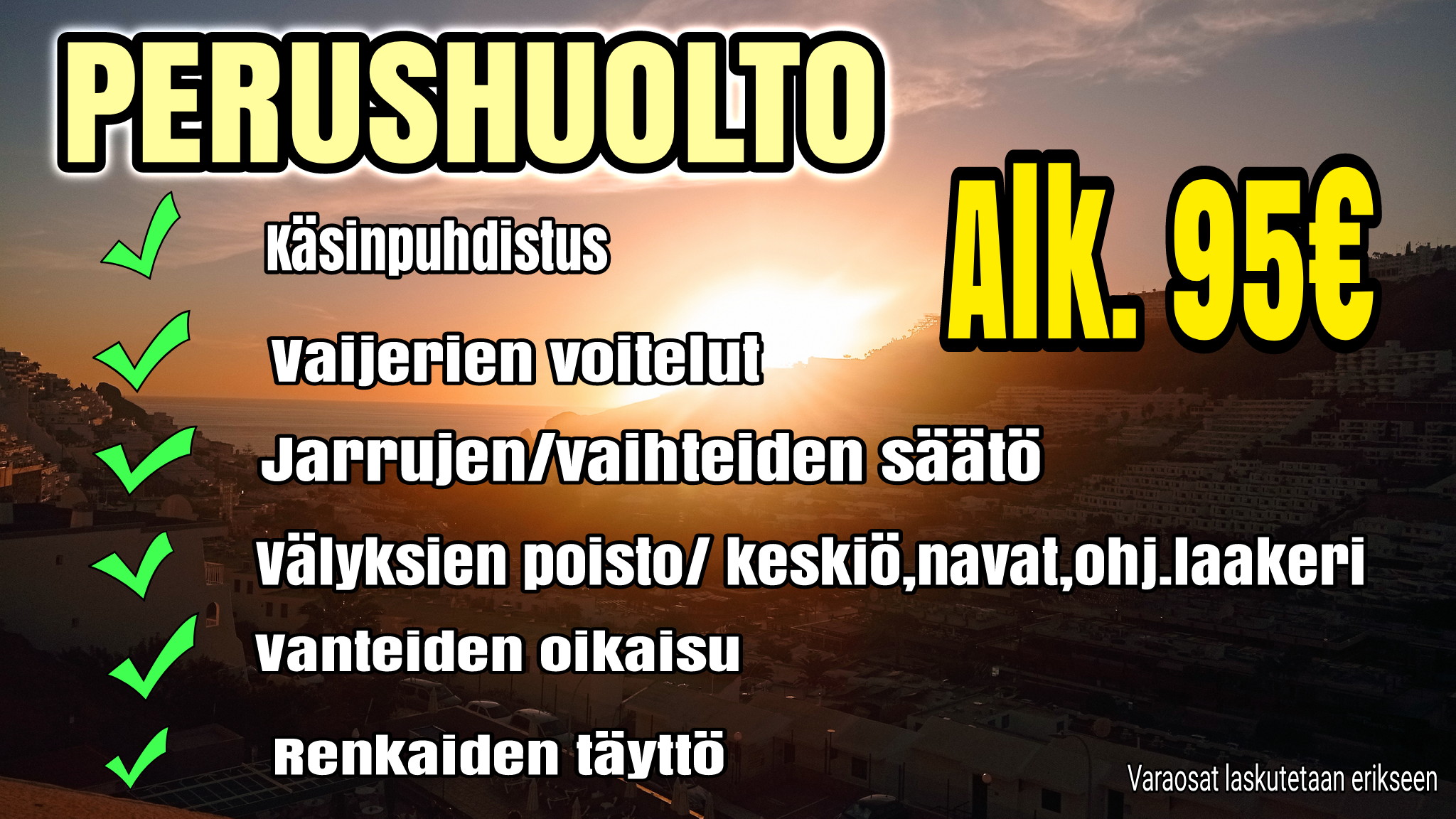 Muuta HUOMIOITAVAA : Jos huomaamme että korjaukseen tarvitaan selvästi enemmän varaosia yms.  , ilmoitamme asiasta sinulle  ja sovimme tehtävät työt/lisäkustannukset tapauskohtaisesti .